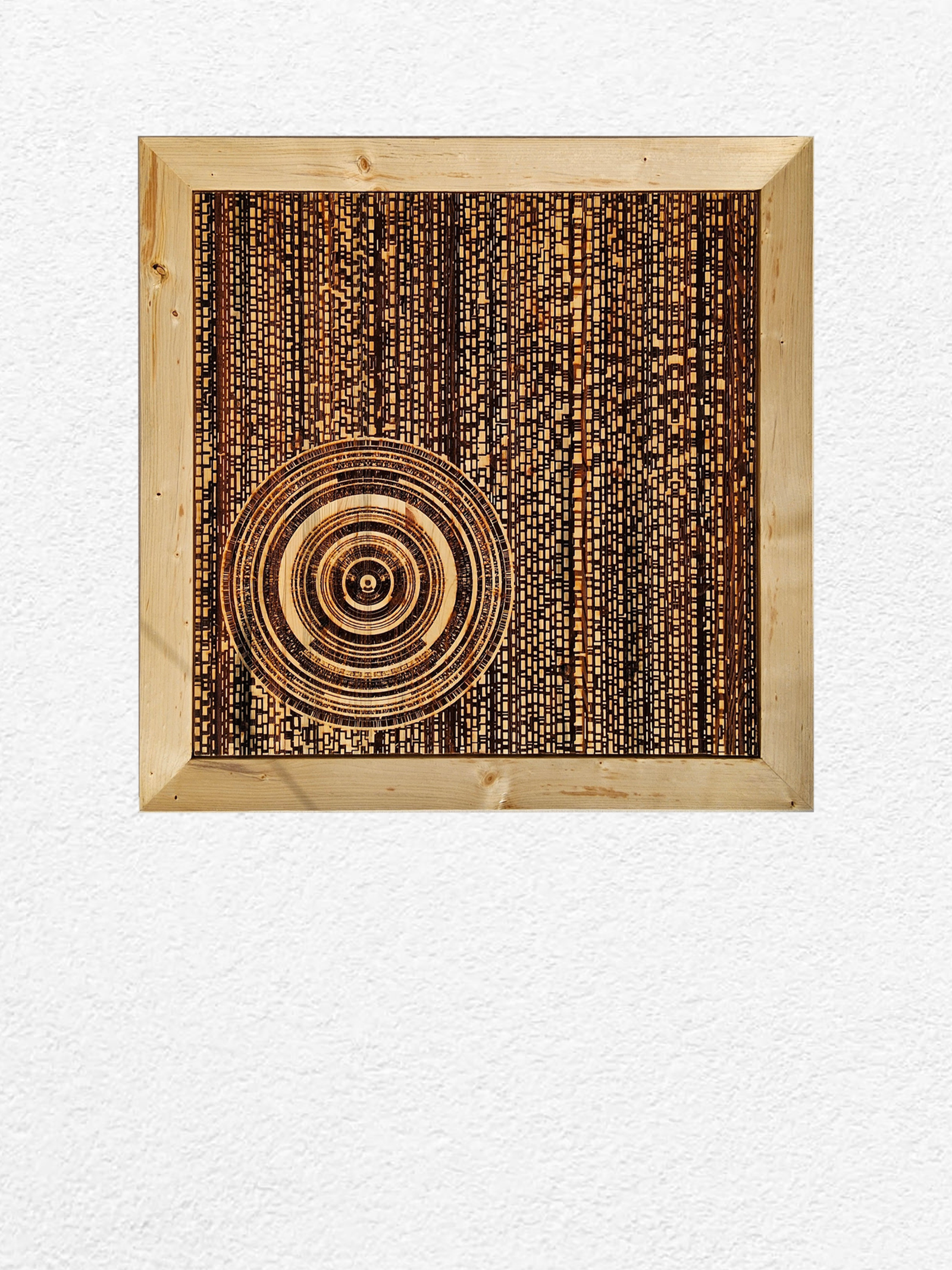 A cruciform figure held within fields of dense texture emerges on wood. Its outline feels both fragile and enduring, a threshold where shadow becomes presence.