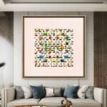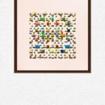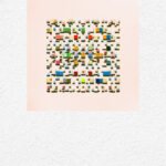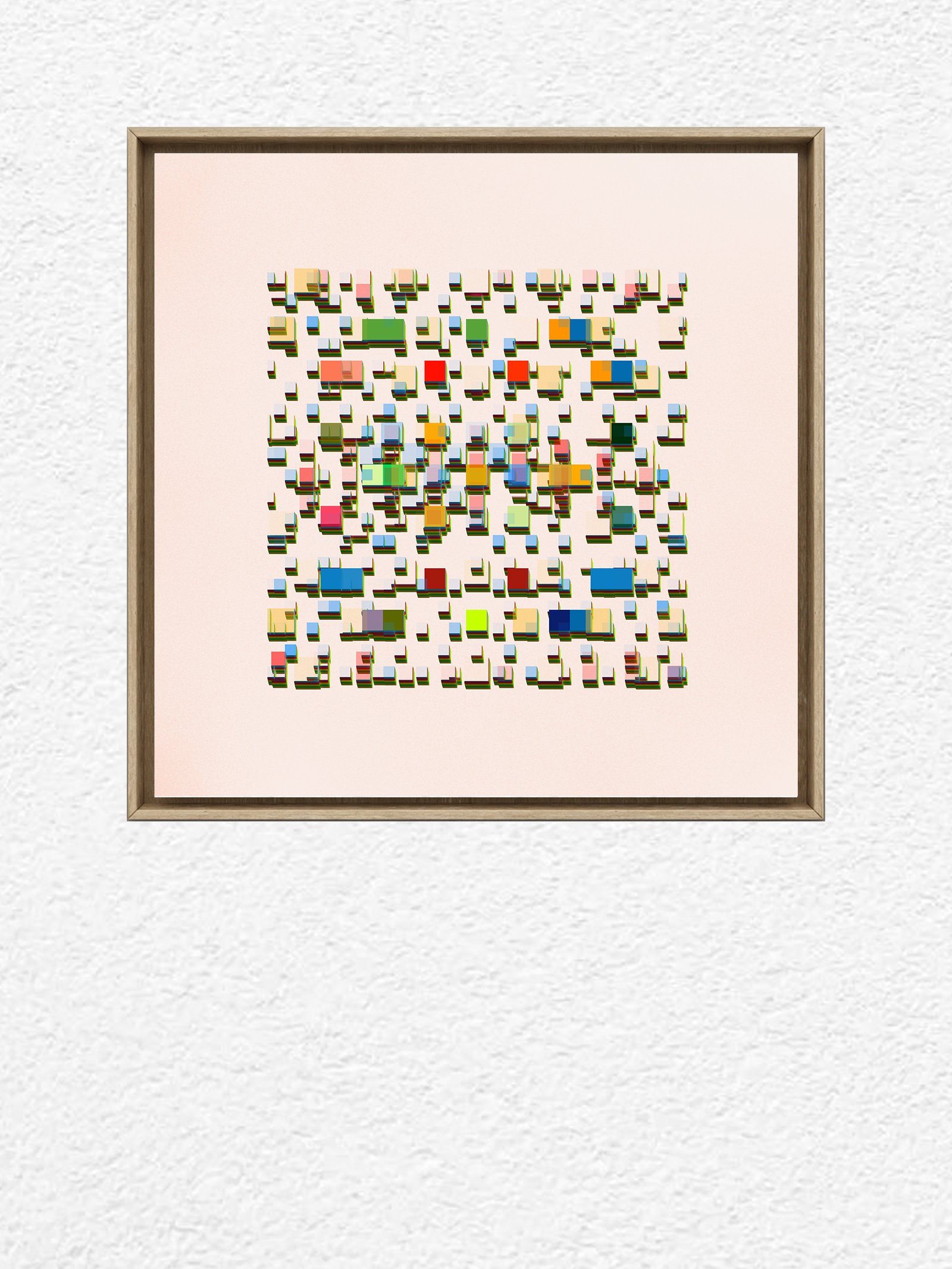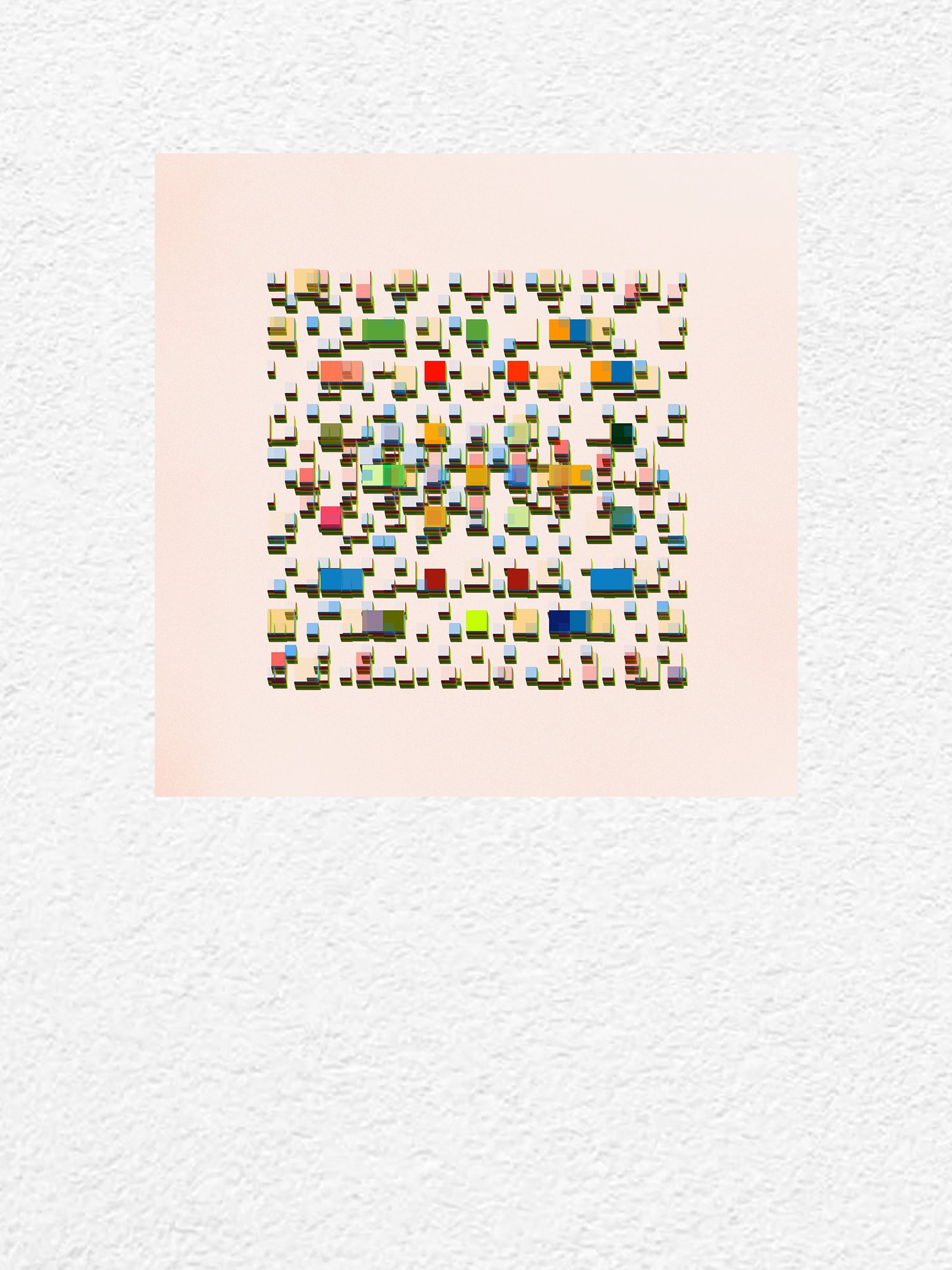 An array of colorful rectangular forms drifts like scattered building stones, capturing the unpredictability of moments.
